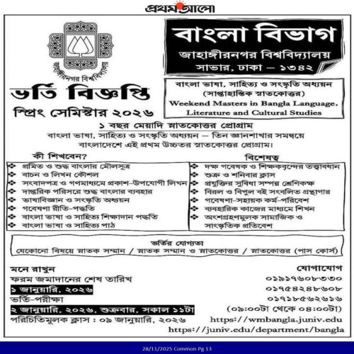 বাংলা বিভাগ, জাহাঙ্গীরনগর বিশ্ববিদ্যালয়ের সাপ্তাহান্তিক স্নাতকোত্তর স্প্রিং সেমিস্টার ভর্তি বিজ্ঞপ্তি-২০২৬